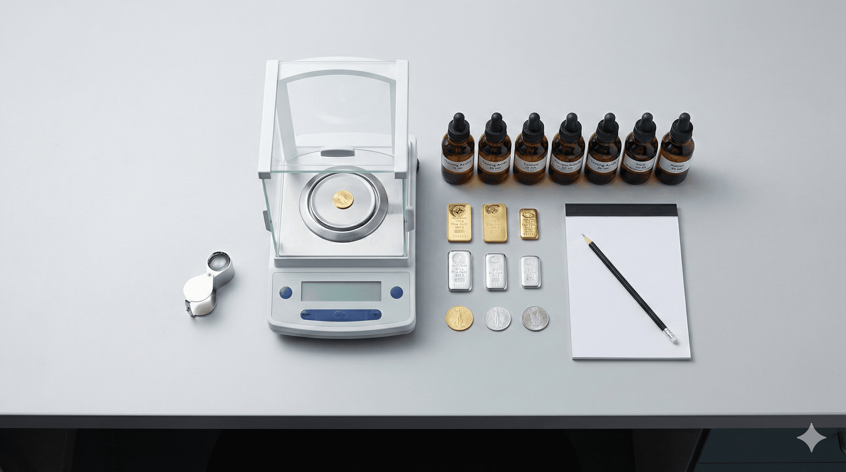 Bullion items are tested using XRF for initial screening and fire assay for definitive purity determination. Specific gravity testing may be used as a complementary method. Detailed assay certificates are issued.